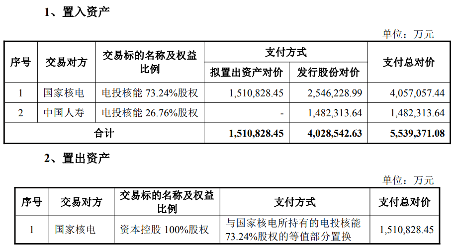 中国经济网北京12月5日电:中国电力投资集团公司(000958.SZ)昨日晚间发布公告称,公司拟通过资产置换及发行股份的方式收购国家电投核能有限公司100%股权,同时收购国家电投控股有限公司100%股权并募集配套资金(简称本次交易)。深圳证券交易所并购重组审核委员会将于2025年12月4日召开2025年第十二次并购重组审核委员会审议委员会,对本次交易的申请进行审核。根据深交所并购重组审核委员会发布的《深交所并购重组审核委员会2025年第十二次审核会议结果公告》,本次会议审核结果为:本次交易符合e 监管条件和信息披露要求。重组委会议提出的主要问题:请上市公司代表结合行业发展趋势、市场竞争格局、新增用电可行性、电价、原材料价格变动趋势等情况,对业绩承诺履行情况进行说明。请独立财务顾问代表提供明确的意见。需要进一步落实的事项:无。电产融投表示,本次交易尚需获得中国证监会核准登记。能否获得中国证监会的注册批准以及能否获得这个最终时间还存在不确定性。公司将根据此事进展及时履行信息披露义务按照有关法律、法规的规定和要求。请投资者注意投资风险。投力财业11月27日披露的《主换产权及发行股份购买资产及募集配套资金及关联交易报告(草案)》(会议草案)显示,公司交易内容包括主换产权、发行股份购买资产及募集配套资金。本次交易拟购买的房产为中电核电与中国人寿共同持有的中电投核能100%股权,拟购买的资产为上市公司持有的资本控股100%股权。上市公司拟以国家核电持有的100%资本控股股权换取国家核电持有的电力投资及核能股权等值份额国家核电;对于购买资产与被购买资产之间的差额,上市公司将发行股份向中国国家核电、中国人寿购买。同时,上市公司拟向不超过35名特定投资者发行股票募集配套资金,募集资金不超过500万元,用于山都海阳核电站3、4号机组项目。公告显示,拟投资资产交易对价为5539,371.08万元,增值率为99.65%,拟购买资产交易对价为1510,828.45万元,增值率为46.85%。公司本次独立财务顾问为中信证券股份有限公司、中银国际证券有限责任公司,保荐人为李中杰、王泽石、康浩宇、向林、张玉标、姜宏、庆新。