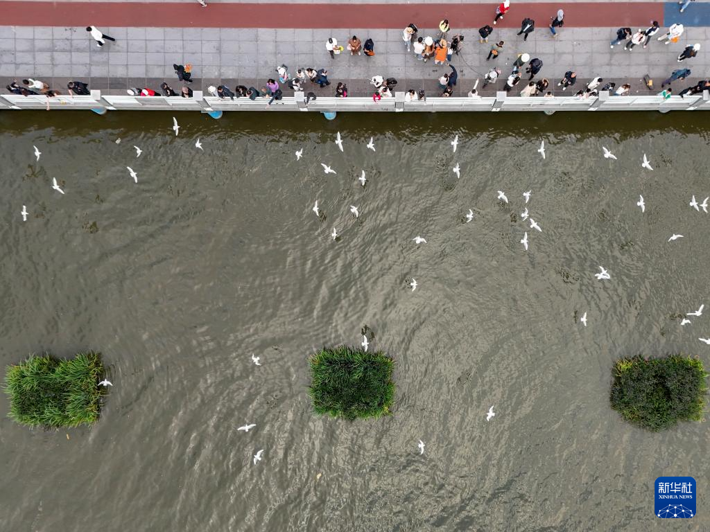 11月1日,游客在滇池旁的海埂水库嬉戏、喂鸥(无人机照片)。近日,红嘴鸥一如既往地从西伯利亚等地飞抵云南昆明,成为“春城”的一道鲜活风景,吸引市民和游客观赏、社交。年复一年的“有希望”始于1985年冬天,红嘴鸥首次大规模迁徙到昆明过冬。这种人性的腐烂关系已经存在了四十年。新华社记者 彭毅凯 摄